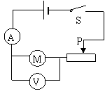 小明同学的玩具电动车上,有一微型直流电动机,小明将它接在图示的电路中,闭合开关后,移动变阻器的滑动片P。(1)当v示数为0.3V时,电动机不转动,此时A示数为0.3A。求电动机线圈的电阻是多大?(2)当v示数为3V时,电动机正常转动,此时A示数为0.4A。求电动机的发热功率及对外做功的机械功率。