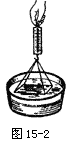 3.如图15-2所示,将一表面干净的玻璃板挂在弹簧秤下面,手持弹簧秤的上端将玻璃板放至刚与水面接触后,慢慢提起弹簧秤,观察到玻璃板未离开水面时弹簧秤的示数比离开水面后的示数_________,其原因是_________. (题型二)