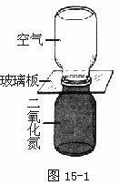在装着红棕色二氧化氮气体的瓶子上面倒扣一个空瓶子,使两个瓶口相对,之间用一块玻璃板隔开,如图15-1所示.抽掉玻璃板,我们会看到:虽然二氧化氮的密度比空气大,但由于分子的相互进入,过一段时间后,两瓶中的气体都变成了红棕色,但颜色要比纯二氧化氮气体的颜色浅.