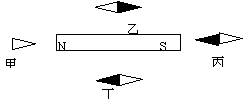 如下图所示,一条形磁铁的周围放着能自由转动的小磁针甲、乙、丙、丁,这四根磁针静止时磁极指向画错的是(磁针的黑端表示N极) ( )
