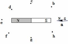 [做一做]如课本中图16-3所示,将小磁针先后放在条形磁体周围不同的地方,记下小磁针在各处静止时北(N)极的指向,并在下图中标出。(小磁针的画法请仿照a处的画法)