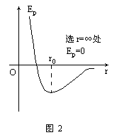 从以上两种情况综合分析,分子间距离以r0为数值基准,r不论减小或增大,分子势能都增大。所以说,分子在平衡位置处是分子势能最低点。如果分子间距离是无限远时,取分子势能为零值,分子间距离从无限远逐渐减少至r0以前过程,分子间的作用力表现为引力,而且距离减少,分子引力做正功,分子势能不断减小,其数值将比零还小为负值。当分子间距离到达r0以后再减小,分子作用力表现为斥力,在分子间距离减小过程中,克服斥力做功,使分子势能增大。其数值将从负值逐渐变大至零,甚至为正值。分子势能随分子间距离r的变化情况可以在图2的图象中表现出来。从图中看到分子间距离在r0处,分子势能最小。