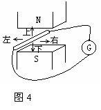 10、 磁场中悬挂一根直导线,导线的两端分别连接在电流表G的两个接线柱上,组成一个闭合电路,如图4所示,当导线沿着图示的方向运动时,有两个方向能使电流表指针偏转,这两个运动方向是: ( )