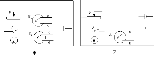 5.初三(2)班物理实践小组在装置直流电动机模型后参加班级的实践成果展示交流会,在会上演示通过改变电动机的转动方向及转速使重物上升或下降的过程,如图A所示,关于控制电动机的电路,可以有如下两种设计方案,方案一的电路元件见图B甲,有两个单刀双掷开关(当触片K1接通a时触片K2接通c,当触片K1接通b时触片K2接通d)和一个电源。方案三的电路元件见图B乙,只有一个单刀双掷开关(触片K接通a,或接通b),但有两个电源,请你任选其中一个设计方案(多选无效)完成电路图的连接。(操作过程中不得再改变电路中的接线)