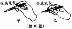 10.(南宁中考题) 小莉把新安装好的字调机接人家中电路时,家里的用电器突然同时停止工作。小莉用测电笔检测,发现总保险丝熔断了。引起电路中电 流过大的原因可能是发生了短路或_____________。如图所示是小莉用测 电笔检测电路的示意图,其中正确的是________图。