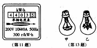 13.(烟台中考题) 观察如图所示的两只白炽灯泡,其中_____灯泡的电阻大,______ 灯泡的额定功率大。(填“甲”或“乙”)。
