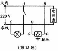15.(北京中考题) 如图所示是某居民家中的部分电路,开始时各部分工作正常。将电饭煲的插头插入三孔插座后,正在烧水的电热壶突然不能工作,但电灯仍正常工作。拔出电饭煲的插头,电热壶仍不能工作。把测电笔分别插入插座的左、右插孔,氖管均能发光。若电路中仅有一处故障,则 ( )