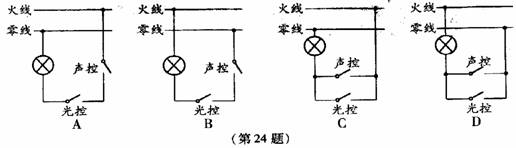 24.(福州中考题) 为了节能、方便,有的楼道照明灯使用声控、光控开关,其原理是:光控开关在黑暗时闭合,声控开关在有声音时闭合。下面能实现只在黑暗且有声音时灯才亮的电路原理图是( )
