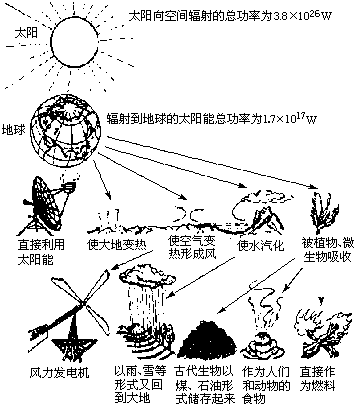 太阳把地面和空气晒热,太阳能转化为内能.晒热的空气上升,空气流动形成风,又转化为风能.太阳把水面和地面晒热,并使一部分水蒸发,蒸发的水汽升到空中形成云,以雨、雪的形式落下来,流入江河,太阳能转化为水能.植物吸收太阳能,发生光合作用,太阳能转化为植物的化学能.植物作为食物被动物吃掉,又转化成动物的化学能.古代的动植物在地质变迁中变为煤、石油、天然气,转化为这些燃料的化学能.