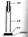 实验装置如图,自选若干待测材料如肥皂、橡皮泥、塑料、铝片、瓷片等,将被测材料置于一个空心竖直管的底部,从管的顶部释放一钢钉,钢钉作用在该材料上会产生一个小小的凹痕。根据___________现象,从而判断材料的硬度大小。