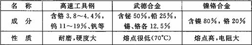 根据上表提供的信息,你认为电炉丝应选用________________________丝绕制而成,加工零件用的刀具、钻头应选用_______________________制成(本题选填合金名称).