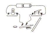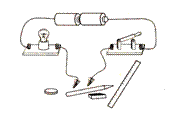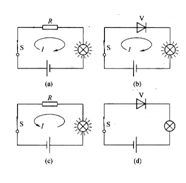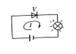 §19-2 半导体 1、让学生看课本P158-159页,通过“太阳能电池、条形码扫描器、微处理器、机器人”等内容,了解半导体的应用。 2、演示实验: 探究半导体二极管单向导电特性 仪器与器材:电源、半导体二极管V、电阻R、灯泡、导线、接线板、接线柱. 实验电路,如右图所示. 步骤:(1)取一个电阻R和一个半导体二极管V,分别接成如图中(a)、(b)所示电路.闭合开关,观察灯泡发光情况.(2)把电池的正、负极互相调换后,将变成如图中(c)、(d)所示的电路.闭合开关,观察灯泡发光情况. 分析得出结论 1、展示各种半导体元件:半导体二极管、光电二极管、热敏电阻、发光二极管、三极管及集成电路等 3、导体和绝缘体并没有绝对界限 |