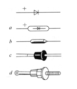 示允许电流通过的方向。图中a为玻璃管封装型,b为塑料封装型,c