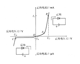 半导体二极管的这种特性,可用前面所述的二极管伏安特性曲线来进一步描述。如右图所示,图中的坐标O点,表示当二极管两端不加电压时,没有电流通过。当二极管加上正向电压时,就有正向电流通过。图中的OA段较平坦,说明这一段范围内,随正向电压增加