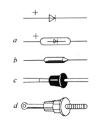 示允许电流通过的方向。图中a为玻璃管封装型,b为塑料封装型,c