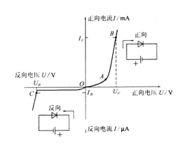 半导体二极管的这种特性,可用前面所述的二极管伏安特性曲线来进一步描述。如右图所示,图中的坐标O点,表示当二极管两端不加电压时,没有电流通过。当二极管加上正向电压时,就有正向电流通过。图中的OA段较平坦,说明这一段范围内,随正向电压增加