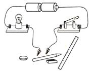 仪器与器材:电源、半导体二极管V、电阻R、灯泡、导线、接线板、接线柱.