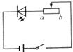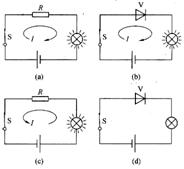 步骤:(1)取一个电阻R和一个半导体二极管V,分别接成如图中(a)、(b)所示电路.闭合开关,观察灯泡发光情况.(2)把电池的正、负极互相调换后,将变成如图中(c)、(d)所示的电路.闭合开关,观察灯泡发光情况.