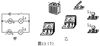 27.在下图13(7)中请你以笔代线将根据甲图中的电路图连接好电路。(其中A1的量程为0-0.6A,A2的量程为0-3A)(2分)