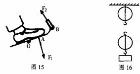 25.如图15,试画出缝纫机脚踏板所受动力、阻力的力臂。