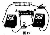 小刚同学测量2.5V小灯泡的电流和电压时,将滑动变阻器与灯串联,用以保护电路.连接的电路如图15:检查电路,发现有一根导线连接错误,请你在连接错误的导线上打“×”,若不纠正错误,闭合开关,会出现 ________现象:在图15中补画出正确的连线(一条),闭合开关前,他应将滑动变阻器的滑片调到_________端(填“A”或“B”).