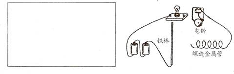 26.如图所示是一种游戏,把铁棒伸进螺旋金属管里穿行,若不小心让铁棒碰到金属管壁,灯泡会亮,同时电铃会响,此时拧去灯泡,电铃仍在响.爱动脑筋的叶展同学经过观察发现,这套游戏装置除了灯泡和电铃外还有两节电池,而铁棒和金属管可以看成是一个开关.请你把这套游戏装置的电路画在下面左边方框内,并把右图中的灯泡和电铃的接线柱连接完整.