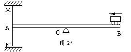 31.如图23所示,均匀木板AB的长度为6m,它可绕位于其中央的支点O转动,左端A通过细绳MA、NA分别系在天花板、地面上.图示状态木板水平,细绳竖直且刚好绷紧.现使一玩具小汽车从B端开上木板,并以0.5m/s速度匀速前进.已知小汽车的功率为4W,质量2kg,g取10N/kg.求: