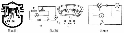 20.某同学赴做“用电流表测电流”的实验中.断用电路如图甲所示.按电路图正确连接电路并接通开关S后,电流表A1、A2偏转的角度相同如图乙,则R l中的电流为 A;A2的读数是 .