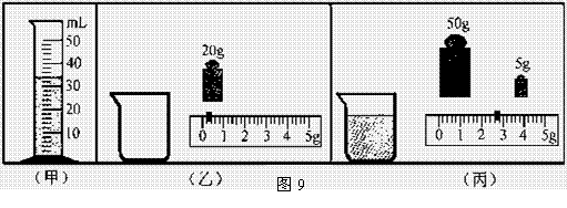 18.固镇中学九年级(1)班课外研究小组的同学测量学校附近浍河水的密度.首先,他们舀取河水倒入量筒如图9(甲)所示.然后,用调节好的天平测量一只空烧杯的质量,当天平平衡时,右盘中砝码和游码的位置如图(乙)所示.最后,将量筒中的河水全部倒入烧杯中,同样用天平测量烧杯和河水的总质量,测量结果如图(丙)所示,则舀取的河水的体积为 ______ m3,质量为 _________ kg ,密度为 ________ kg/m3.