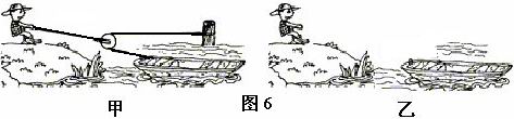 15、小红用一根绳和一个滑轮,借助木桩设计出图6(甲)装置,将船拉近岸边。小明认为这样太费力不合理,他利用同样的工具在图6(乙)中设计了一个省力的方法。请将之画在图6(乙)上。(要求把绳和滑轮画出来,并标出木桩的位置)