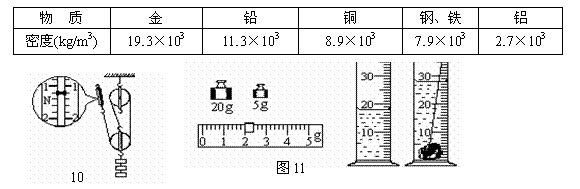 24、(5分)如图14所示为测量滑轮组机械效率的实验装置,每个钩码重1N.实验时要竖直向上拉动弹簧测力计,弹簧测力计的示数为 N,若增加钩码的个数,该滑轮组的机械效率将 .(选填“增大”、“减小”或“不变”) 在“测定物质密度”的实验中,某同学首先测量了一小金属块的质量和体积,如图15所示,由图可知,小金属块的质量为 g,可算出小金属块的密度等于 kg/m3根据下面密度表可推断该金属可能是 .