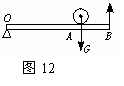 (6分)如图12所示,将质量为10 kg的铁球放在不计重力的木板OB上的A处,木板左端O处可自由转动,在B处用力F竖直向上抬着木板,使其保持水平,已知木板长1 m,AB长20 cm,求F的大小是多少?