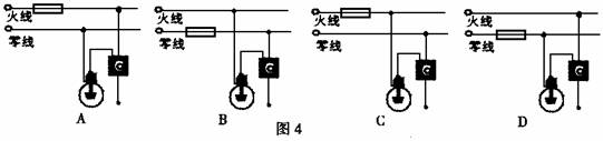 如图4所示,某班同学在学了有关家庭电路的知识后安装了四盏电灯,你认为其中正确的是 ( )