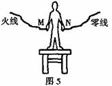 “庆元旦文艺会演”时,物理组的童老师给大家表演了一个“不怕电”的节目.首先童老师将一标有“PZ220 100”的灯泡接到两导线头M、N之间,灯泡正常发光.随后将灯泡取下,童老师站到干燥的木凳上后,左、右手分别抓住M、N两导线头(如图5)。王老师用测电笔分别测试M、N及童老师的皮肤,发现测电笔的氖管都发光,而童老师却谈笑自如。对以上现象的解释,你认为正确的是 ( )