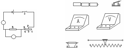 28(8分)、用伏安法测定电阻(阻值约10-15Ω)的实验中,⑴在下图中的圆圈内填上电流表或电压表的符号;⑵连接电路时,开关要 ,闭合开关前,应将滑动变阻器的滑片放在电路图中的 点;⑶本实验所依据的原理是 (用公式表示);⑷请用笔画线代替导线将图示的实物连成正确电路;⑸本实验中常常要多测几组不同的电压和电流值 ,这是为了 。