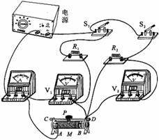 (6分)科技小组的同学们设计了一个多档位的电热器模型,电路实物连接示意图如图所示,电路中电源两端电压保持不变,滑动变阻器的最大阻值为R3。将滑动变阻器的滑片P置于中点M,且只闭合开关S1时,电压表V1的示数位U,电流表的示数I1为0.8A;将滑动变阻器的滑片P置于B端,断开开关S1,闭合开关S2时,电压表V1的示数为