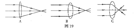 材料、直径都相同的凸透镜A、B、C,并得到如图19所示的光路图.根据此实验现象,对光