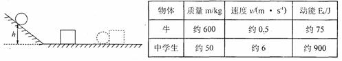 (3)下表给出一头牛慢步行走和一名普通中学生百米赛跑的一些数据.从分析数据中可以看出对物体动能大小影响较大的因素是 。为此判断的依据是 .