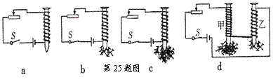 25.为探究电磁铁的磁性跟哪些因素有关,小聪所在的实验小组用漆包线(表面涂在绝缘漆的导线)在大铁钉上绕若干圈,制成简单的电磁铁,结合其它实验器材做了如图所示的实验.