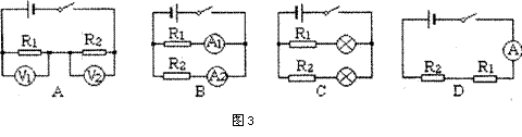 8.现有两个阻值不等的未知电阻R1和R2,为了分辨它们的阻值大小,几个同学分别设计了如图3所示的四种电路(图中小灯泡规格相同),其中不可行的是 ( )