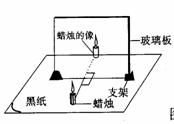 23、某同学在“平面镜成像的特点”实验时,将一块玻璃板竖直架在黑纸的上面,再取两段等长的蜡烛A和B一前一后竖放在直尺上,点燃玻璃板前的蜡烛A,用眼睛进行观察,如图8所示。在此实验中,