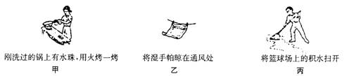 甲、乙、丙三幅图都是加快蒸发的实例.其中 图表示的主要是通过加快液体表面的气体流动来加快蒸发; 图表示的是通过提高液体温度来加快蒸发; 图表示的是通过增大液体表面积来来加快蒸发。