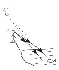 解析:如图所示,人在头部某点A反射出的光线由空气进入水中时,在水面处发生折射,折射光线靠近法线,这些光线射入鱼的眼里,鱼看到这些光线是从它的反向延长线的交点A′发出的,A′就是A的虚像.同理,人其他部分的情形也都一样,显然这个像比人高。