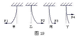 为了探究力的作用效果与哪些因素有关,一同学将钢锯条一端固定在支架上,做了如图19所示实验,其中F1=F2=F4>F3。由甲、乙、丙、丁四图中钢锯条形状变化的比较,你能分析得出哪些结论。