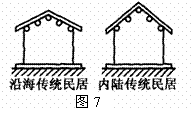我市沿海地区常年刮大风,民居建筑都要考虑这个因素的影响。与内陆地区比较,这里传统民居的屋顶大多化较低平(如图7所示)。刮大风时,低平屋顶上的空气流速增加得_________,屋顶上、下空气压强相差________,屋顶就不容易被风刮掉。(选填“较大”、“较小”)