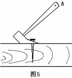 23、小王同学在修理课桌时,像图5那样,用羊角钉锤起钉子,力的作用点为A,试在图中作出最省力的力臂。