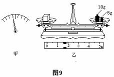 28、放在水平台面上的托盘天平,使用前应将游码放在零刻度线处。若发现托盘天平的指针静止在分度盘中线的左侧,如图9(甲)所示,应采取的措施是 ,图(乙)是一次测金属块的质量的实验,天平平衡时,砝码和游码如图所示,则金属块的质量为________________g。