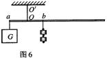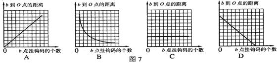 如图6所示,绳子OO′悬吊着质量忽略不计的杆,在杆的a点挂上重物G,在O右侧某点b处挂上钩码.重物G的质量及a到O的距离不变,要使杆保持水平,b点挂的钩码个数(各个钩码质量相同)和b到O的距离的关系是图7中哪一幅图?( )