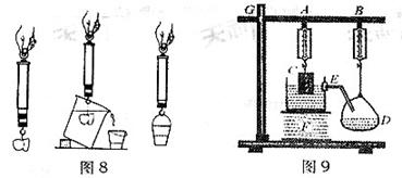 2. (8分)同学们在学习“阿基米德原理”这节课上.仔细观察了老师所做的演示实验(如图15所示).课后复习时.物理兴趣小组的同学们,经过反复的思考、讨论,提出了对该实验的改进意见,并动手制作出了如图16所示的实验装置,其中A、B为两个规格相同的弹簧秤,C为重物,