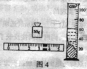 19.用天平测一块石头的质量,所用砝码和游码的位置如图4所示;用量筒测石块体积,量筒内原有40cm2的水,放入石块后量筒中水面的位置如图所示,则石块的质量为 g,体积为 cm3 ,石块的密度为 kg/m3。